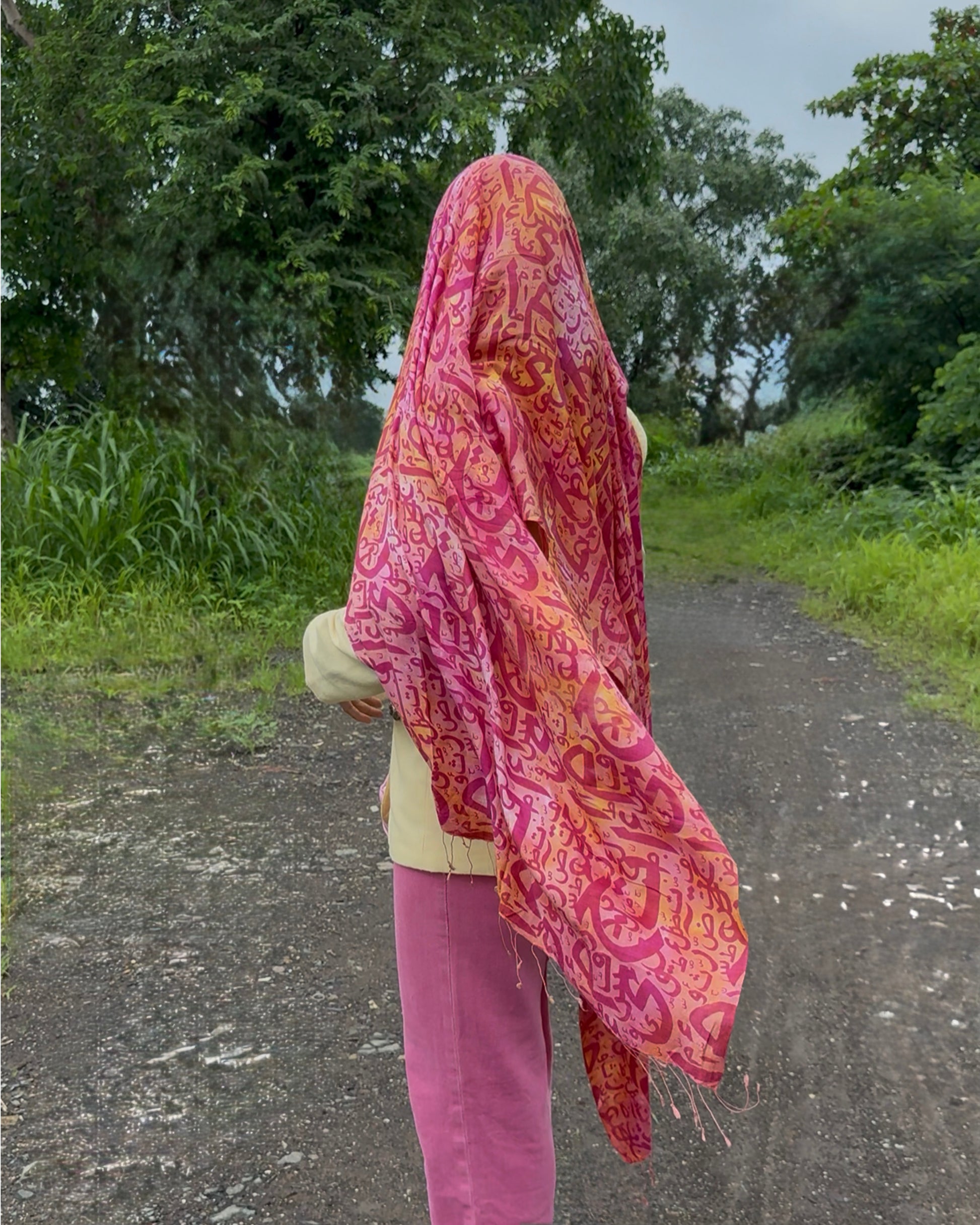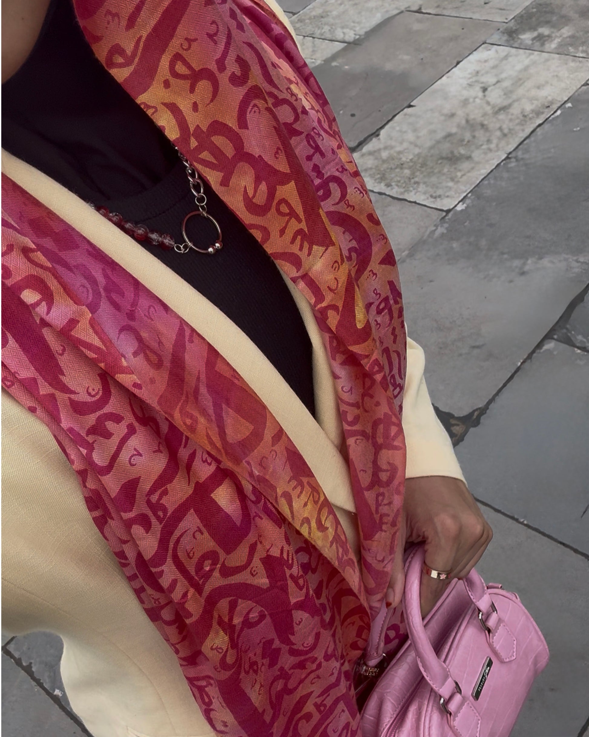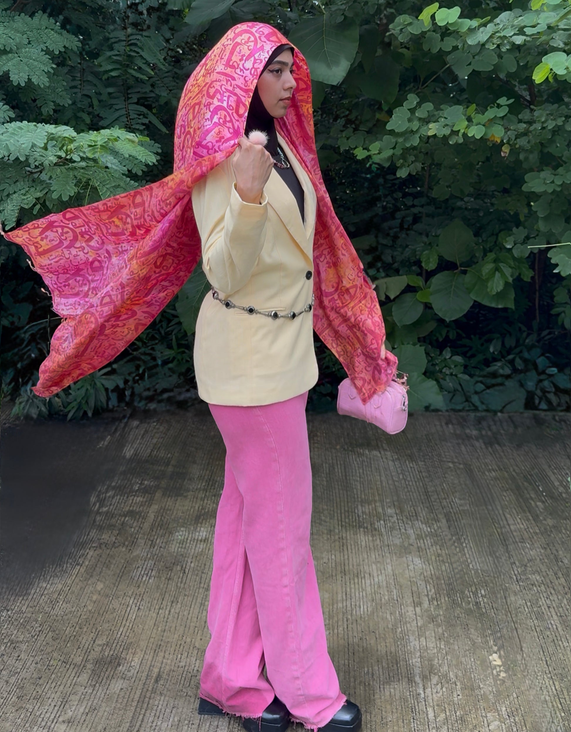 The Flaming Rose Script from our Hurf Collection is 2 meters —wrapped in vibrant pink, deep orange, and bold Arabic calligraphy.