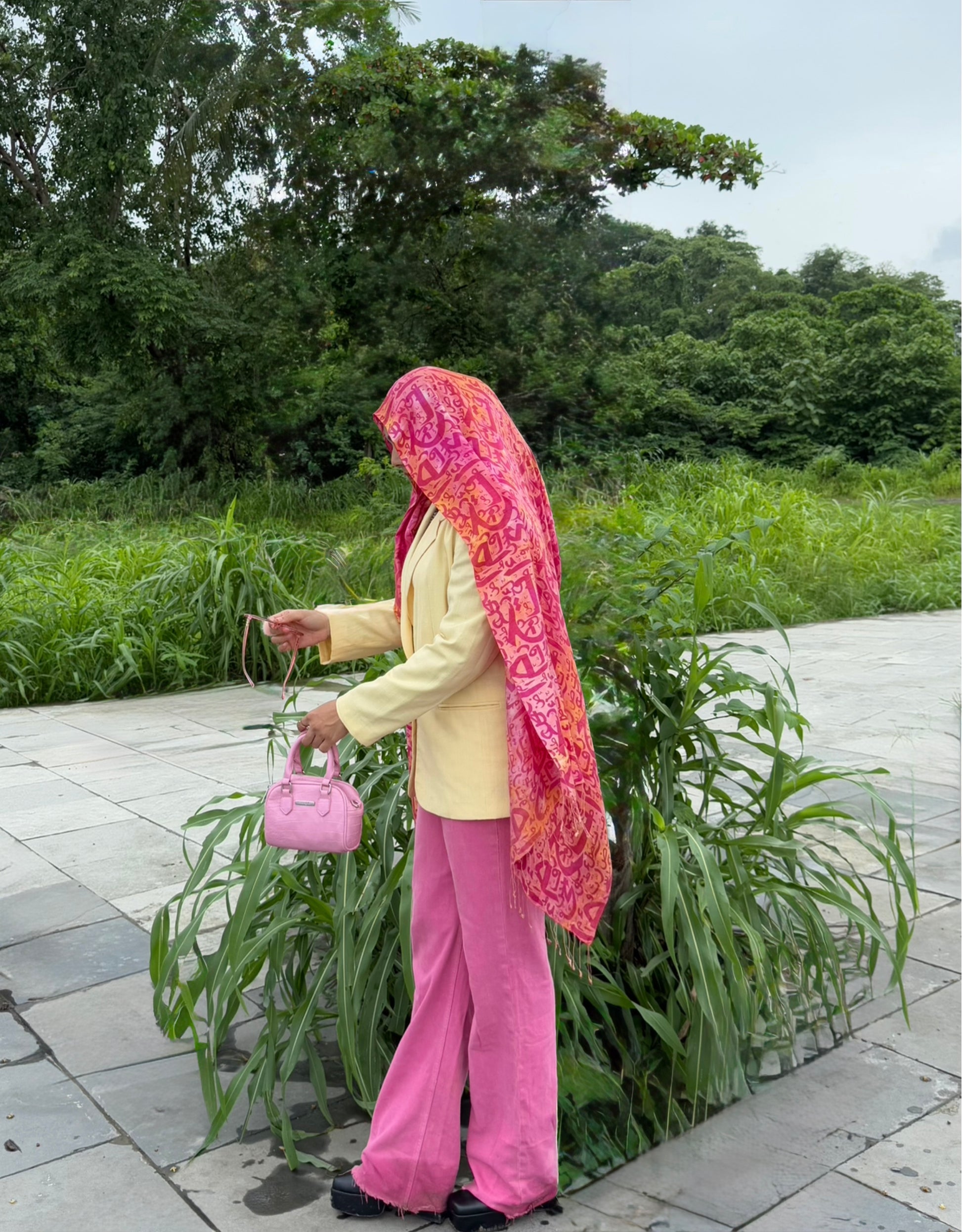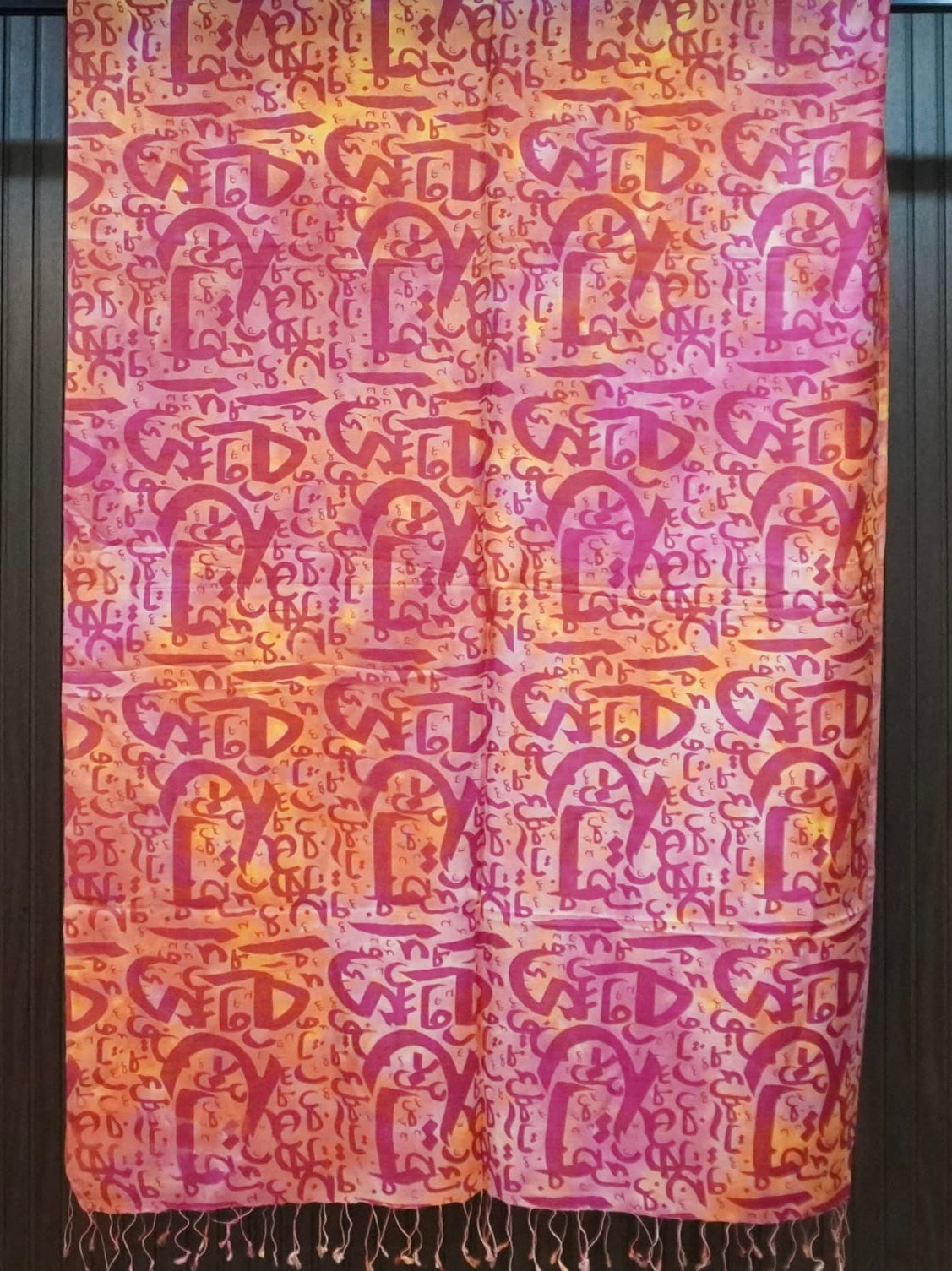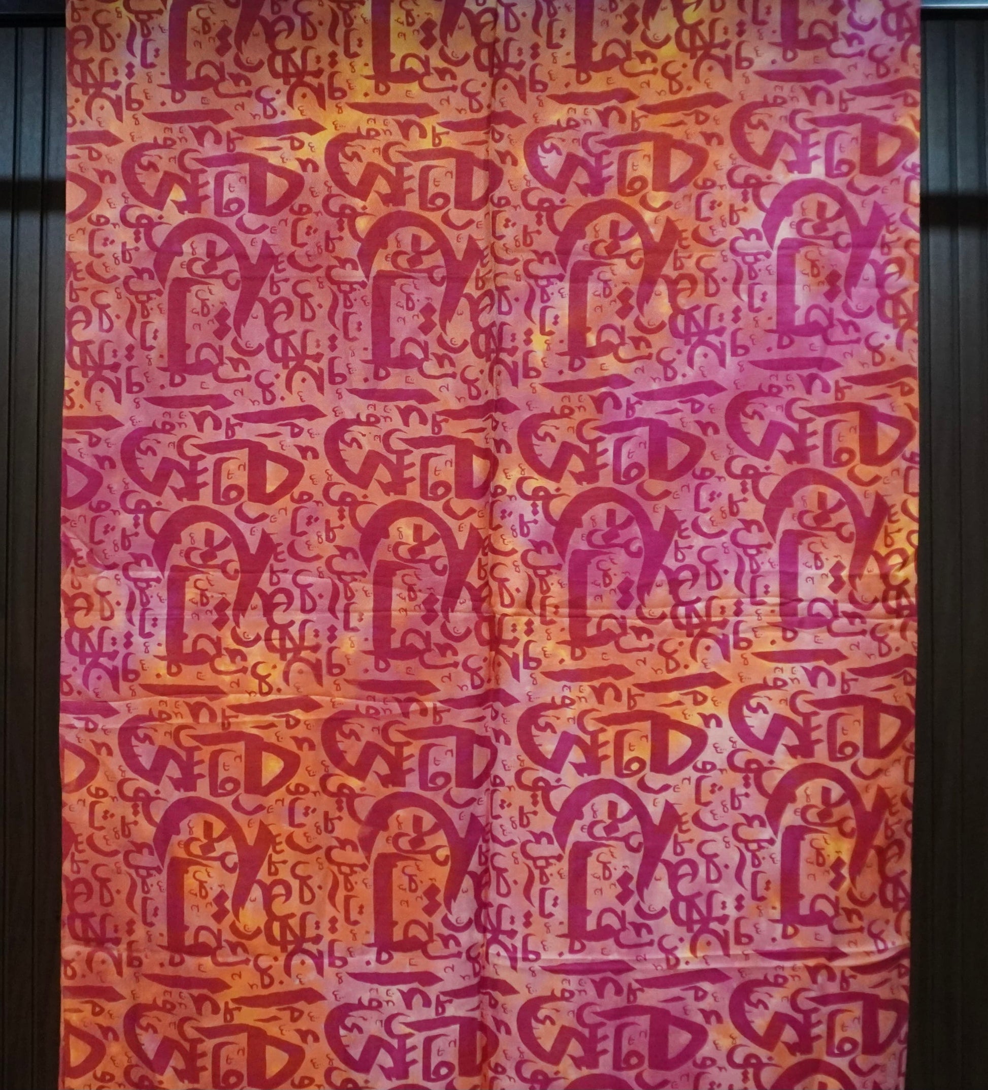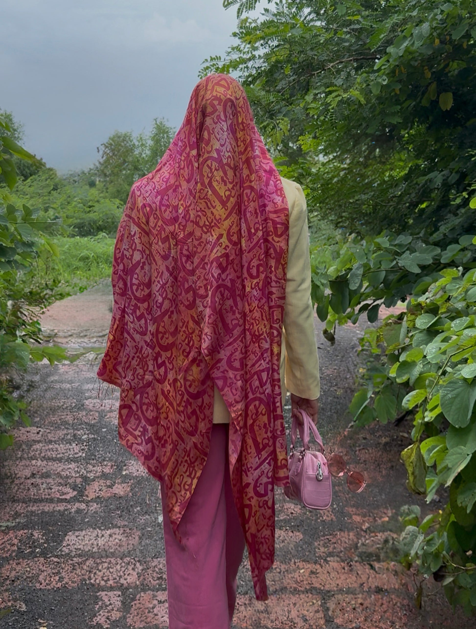 The Flaming Rose Script from our Hurf Collection is 2 meters —wrapped in vibrant pink, deep orange, and bold Arabic calligraphy.